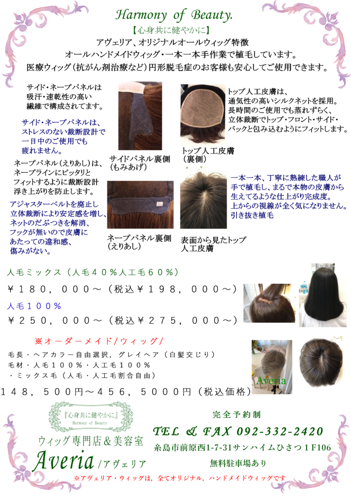 Averia (アヴェリア)は、完全予約制のウィッグ専門店であり美容室です。急にウィッグがご必要の場合でも即日対応・当日お渡し可能です。